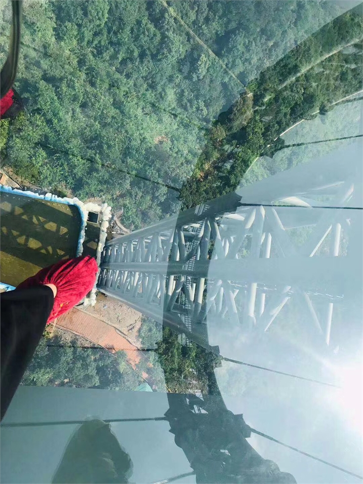 僅僅是漂流行程那還是不夠刺激的,同事們就出發玻璃棧道中的網紅大網球拍,行走玻璃棧道的樂趣,遠看倒是覺得還行,但是真實站在上面心中還是有一絲害怕,甚至腳都有點不聽使喚了。在玻璃橋底下也是可以清楚看見的山谷景觀,膽大的同事都在上面逛了好幾圈。充實的黃騰峽之旅就已經結束。
