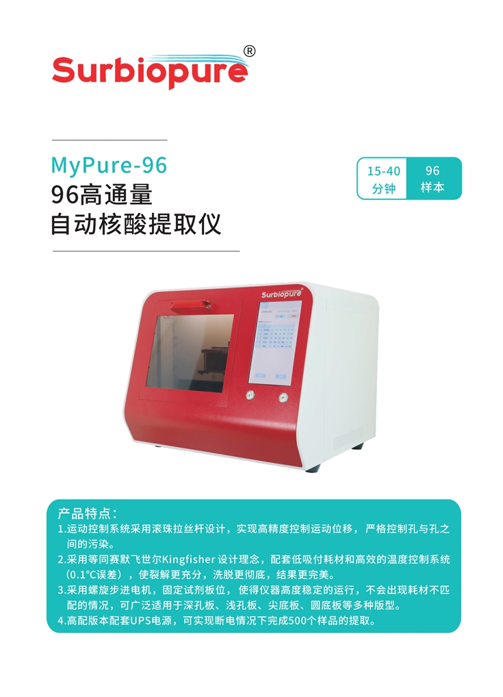 15-40分鐘完成96樣本核酸的全自動(dòng)提取、純化。操作簡(jiǎn)單,提取,純化全流程自動(dòng)化,無(wú)需人工干擾。