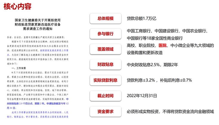而從市場(chǎng)看來(lái),此次引入財(cái)政貼息貸款支持醫(yī)療設(shè)備更新改造,也是國(guó)內(nèi)醫(yī)療新基建的關(guān)鍵一環(huán)。