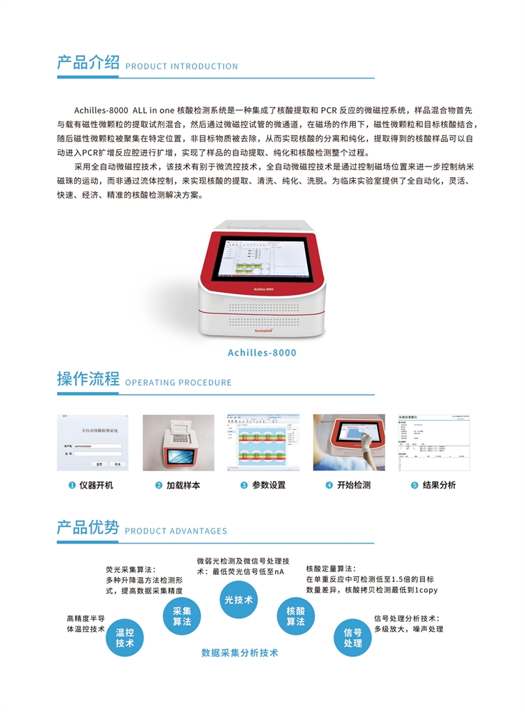 集成了核酸提取和PCR反應的微磁控系統,樣品混合物首先與載有磁性微顆粒的提取試劑混合,通過微磁控試管的微通道,在磁場的作用下,磁性微顆粒和目標核酸結合,隨后磁性微顆粒被聚集在特定位置,非目標物質被去除,從而實現核酸的分離和純化,提取得到的核酸樣品可以自動進入PCR擴增反應腔進行擴增,實現了樣品的自動提取、純化和核酸檢測整個過程。