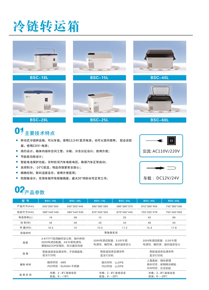 BSC系列冷鏈轉(zhuǎn)運(yùn)箱可以車(chē)載,使用12/24V直流電源,也可以室內(nèi)使用,配合適配器,使用220V~電源;