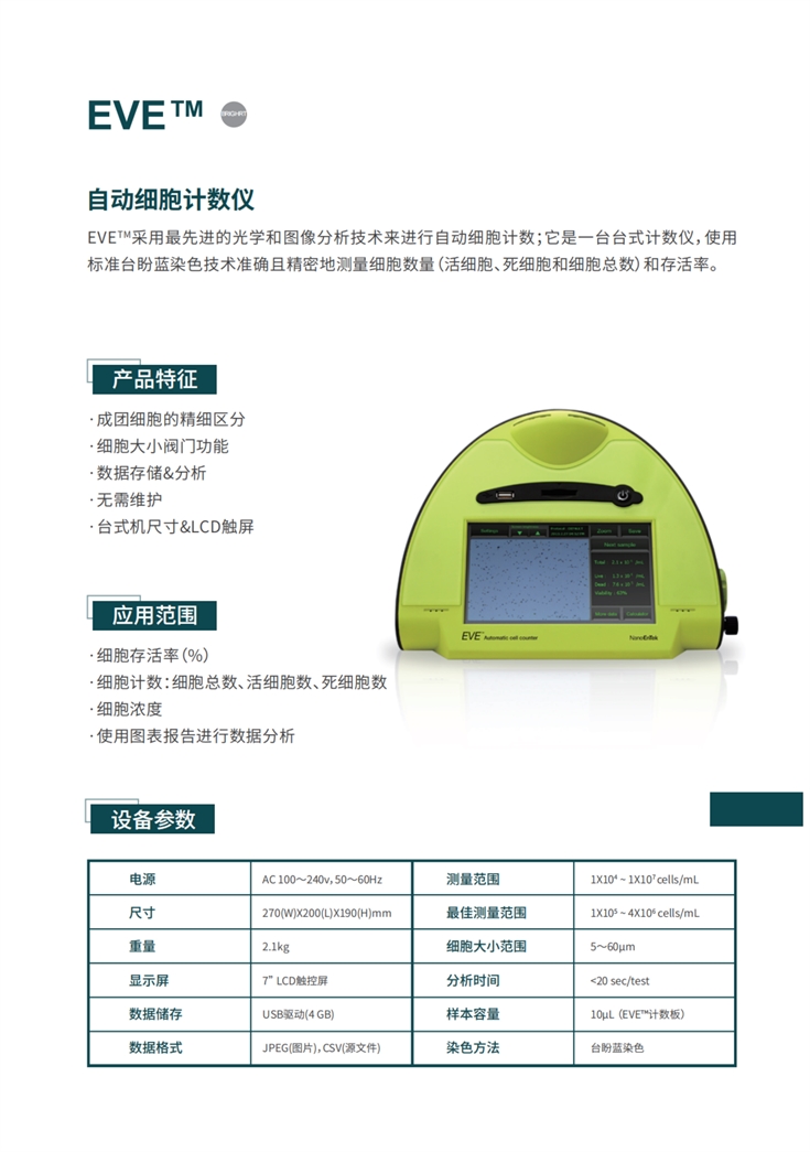 EVE?采用最先進的光學和圖像分析技術來進行自動細胞計數;它是一臺臺式計數儀,使用標準臺盼藍染色技術準確且精密地測量細胞數量(活細胞、死細胞和細胞總數) 和存活率。