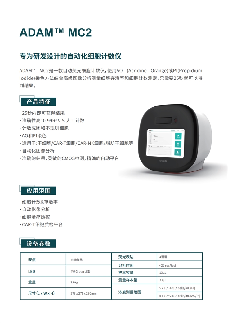 ADAM?MC2是一款自動(dòng)熒光細(xì)胞計(jì)數(shù)儀,使用A0(Acridine Orange)或Pl(Propidiumlodide)染色方法結(jié)合高級(jí)圖像分析測(cè)量細(xì)胞存活率和細(xì)胞計(jì)數(shù)測(cè)定,只需要25秒就可以得到結(jié)果。